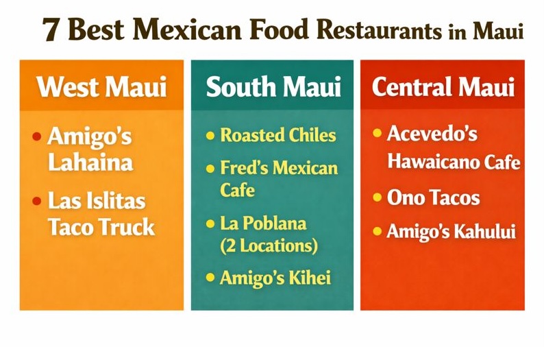 South Maui (Kihei, Wailea, Makena): Roasted Chiles for a sit-down meal, Fred’s when you want happy hour plus a sunset view, La Poblana for quick tacos and burritos, and Amigo’s in Kihei when you want something dependable.