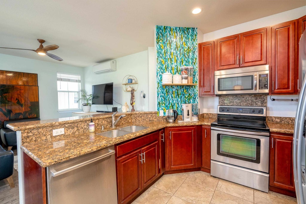 Unit 5-203 is designed with both style and functionality in mind. With vaulted ceilings and large windows that allow natural light to fill the space, the home feels open, bright, and welcoming. The living area features an upgraded split AC system installed just two years ago, ensuring cool comfort year-round. Granite countertops in the kitchen, along with modern appliances including a dishwasher, range, microwave, and full-sized washer and dryer, make everyday living effortless. Interior features such as ceiling fans, cable-ready TV access, and designer lighting touches like the chandelier/swag lamp add to the modern island charm. With 886 square feet of well-utilized space, it’s easy to see how this condo balances livability with contemporary elegance.