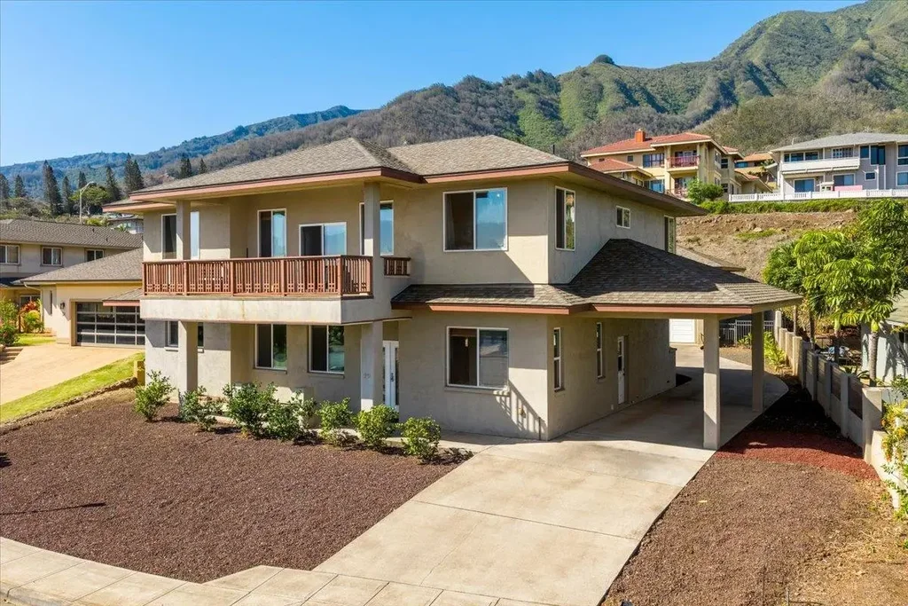 Situated on a quiet cul-de-sac within the gated community of Koa at Kehalani, this impressive two-story stucco residence offers an exceptional blend of space, comfort, and island elegance. Encompassing 3,294 square feet of living area, the home features five bedrooms and four and a half baths, highlighted by soaring vaulted ceilings and thoughtful architectural details throughout. Enter through striking glass double entry doors into a main level designed for both everyday living and elegant gatherings. This level includes a great room, formal living room, formal dining room, breakfast nook, and a beautifully appointed kitchen with granite countertops, stainless steel appliances, and rich wood cabinetry. The kitchen is enhanced by a corner sink framed by mitered glass windows. A convenient laundry room with matching cabinetry and a laundry sink is located just off the kitchen, along with an additional half bath for guests. The spacious first-floor primary suite is a private retreat, featuring a sitting area with a bay window, direct access to a covered lanai, and a luxurious en-suite bath with a large walk-in closet, jetted tub, separate shower, enclosed toilet room, and dual vanities with vessel sinks. The lower lanai provides an inviting setting for relaxing or entertaining in the island breeze. Upstairs, you will find four bedrooms and three full baths, including one bedroom with an en-suite bath and two bedrooms connected by a Jack-and-Jill bath. A versatile loft area opens to a spacious, tiled covered lanai, offering the perfect vantage point to enjoy stunning Haleakala and ocean views. Additional features include a porte cochère, fenced back and side yards, and an expansive 880-square-foot detached four-car garage with its own half bath. Energy-efficient upgrades include solar hot water heating and a 32-panel owned net metered photovoltaic system. This exceptional home combines generous living spaces, quality finishes, and beautiful island views in one of Kehalani’s most desirable gated neighborhoods.